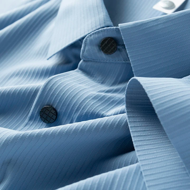 This shirt defines modern minimalism through texture rather than pattern. Designed to offer a distinctive visual profile, the vertical ribbing creates a structured silhouette that captures light and adds depth to a standard white essential. It serves as a foundational piece for a wardrobe that values detail and clean lines. The substantial weight of the fabric allows for a sharp drape that maintains its shape throughout the day, while the contrasting dark buttons provide a deliberate focal point.