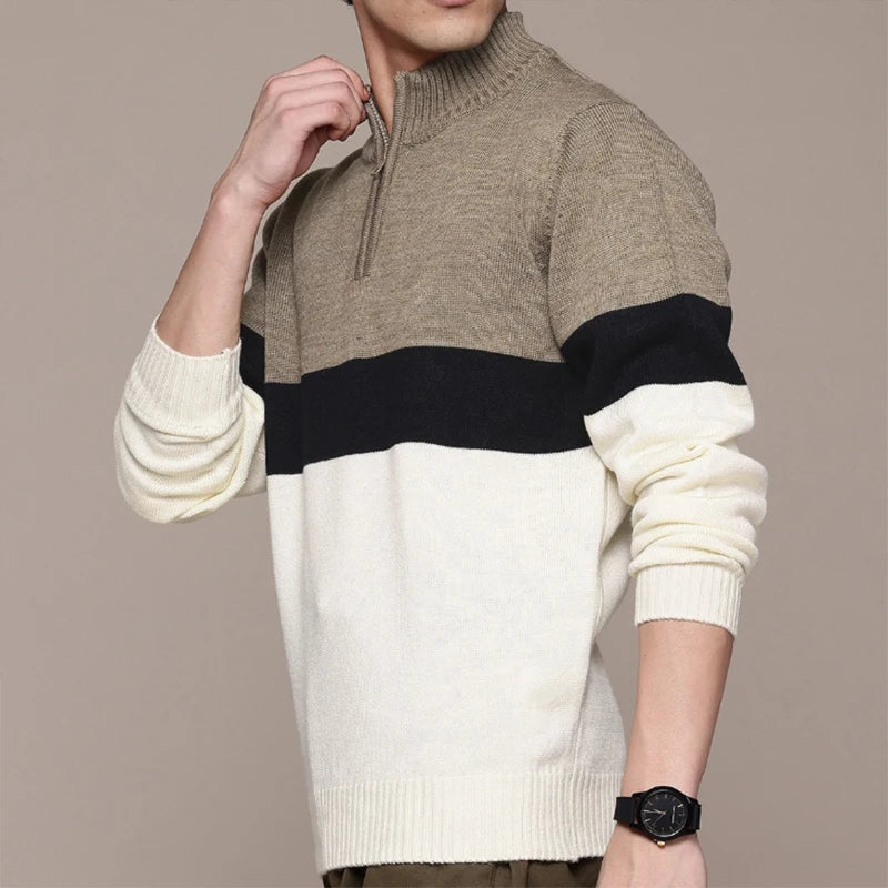 Designed with understated confidence, this men’s quarter-zip sweater brings modern refinement to classic knitwear. Crafted from 100% breathable cotton, it features a bold color-block design in warm neutrals for a versatile, polished look. The ribbed stand collar and clean zip closure deliver structure, while the tailored silhouette ensures a comfortable, flattering fit.