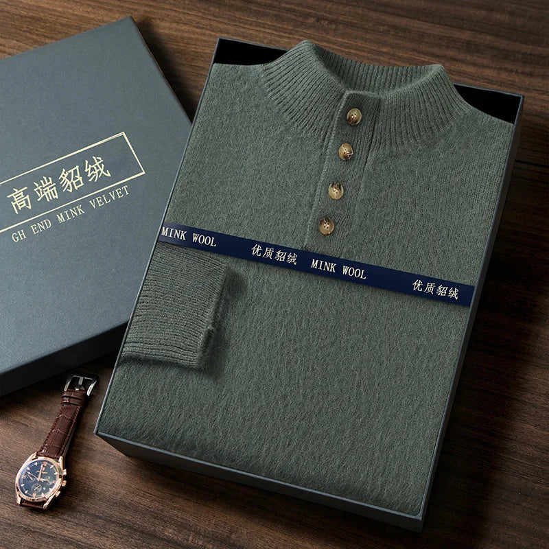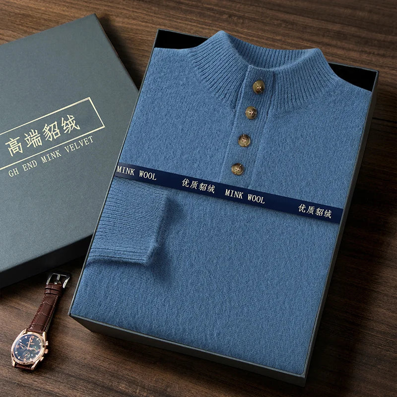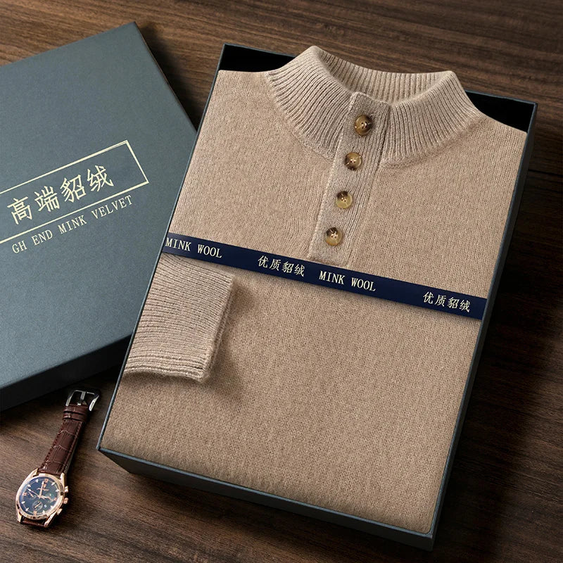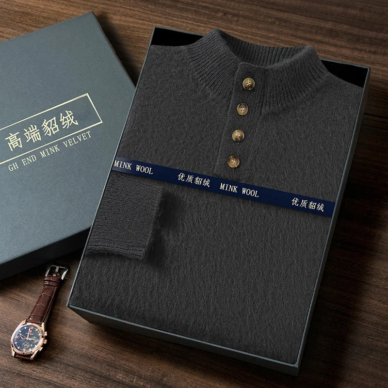 Refined warmth meets effortless style in this men’s mink cashmere sweater. Crafted from an ultra-soft cashmere fibers, it delivers exceptional comfort and a polished appearance. The stand collar with button detailing adds a touch of sophistication, while the ribbed cuffs and hem provide structure and shape. Lightweight yet insulating, it’s the perfect piece for cool-weather layering or elevated casual wear.