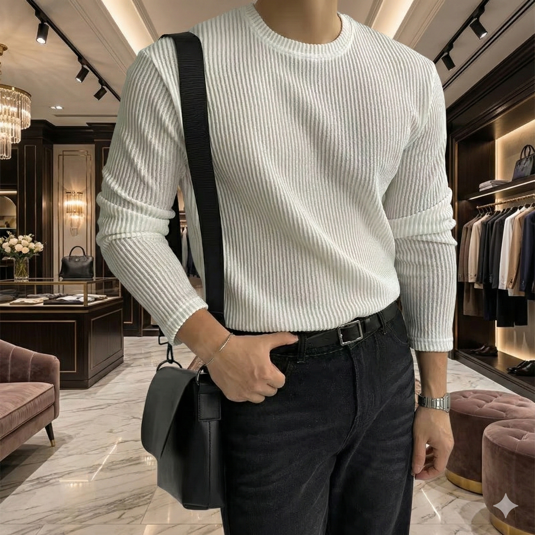 This navy ribbed knit sweater is built for men who appreciate restraint, proportion, and intention. The vertical rib texture sharpens the silhouette without feeling rigid, while the clean crew neckline keeps the look grounded and modern. Styled against a high-end retail backdrop, it reads confident and composed—equally at home in a gallery opening or an evening reservation that didn’t need explaining.