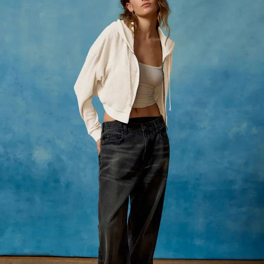 Designed for the moment where street style meets refined ease, this cropped zip sweater elevates everyday knitwear into intentional fashion. The textured knit brings natural visual depth, and the cropped silhouette plays with proportion in a way that feels calibrated yet carefree. The full-zip front and hood nod to classic casualwear, but the clean lines and thoughtful cut turn this staple into something editorial.