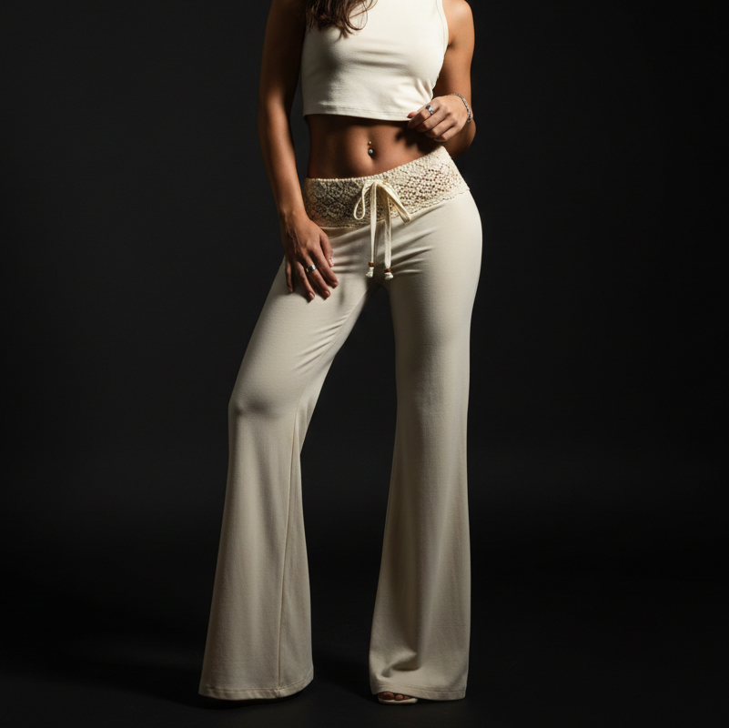 These trousers capture the essence of free-spirited movement and evening sophistication. Designed for those who seek a balance between comfort and a striking aesthetic, they feature a distinctive crochet-lace waistband that sits comfortably on the hips before transitioning into a dramatic flare. Whether you are dancing under the stars at an outdoor party or enjoying a moonlit gathering, the lightweight fabric moves with you, creating a sense of fluid grace. This piece exists to provide a standout alternative to traditional evening wear, offering a silhouette that feels as good as it looks.